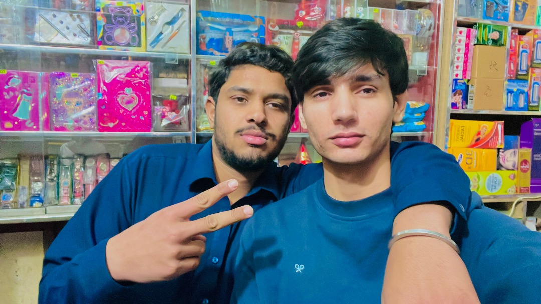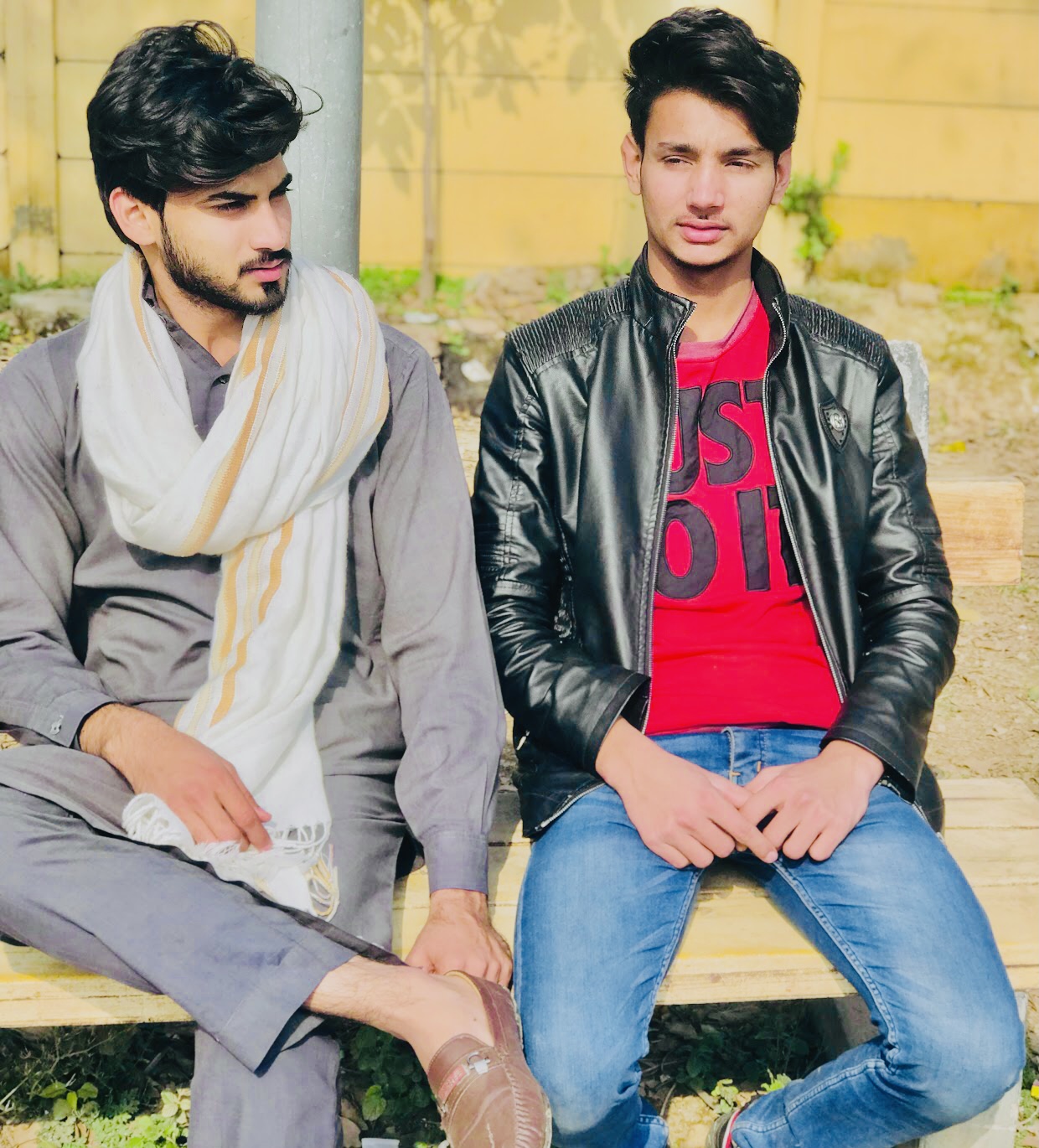 Two young men are casually dressed and engaged in conversation while sitting on a bench outdoors.